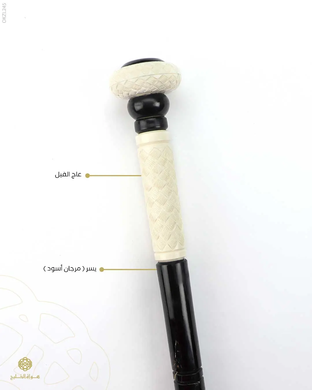 عكاز فاخر مصنوع من اليسر (مرجان أسود) يتميز بلونه العميق ونقوشه الأنيقة. يكتمل تصميمه بزخارف دقيقة من عاج الفيل تضيف