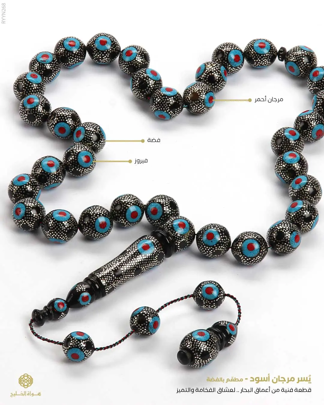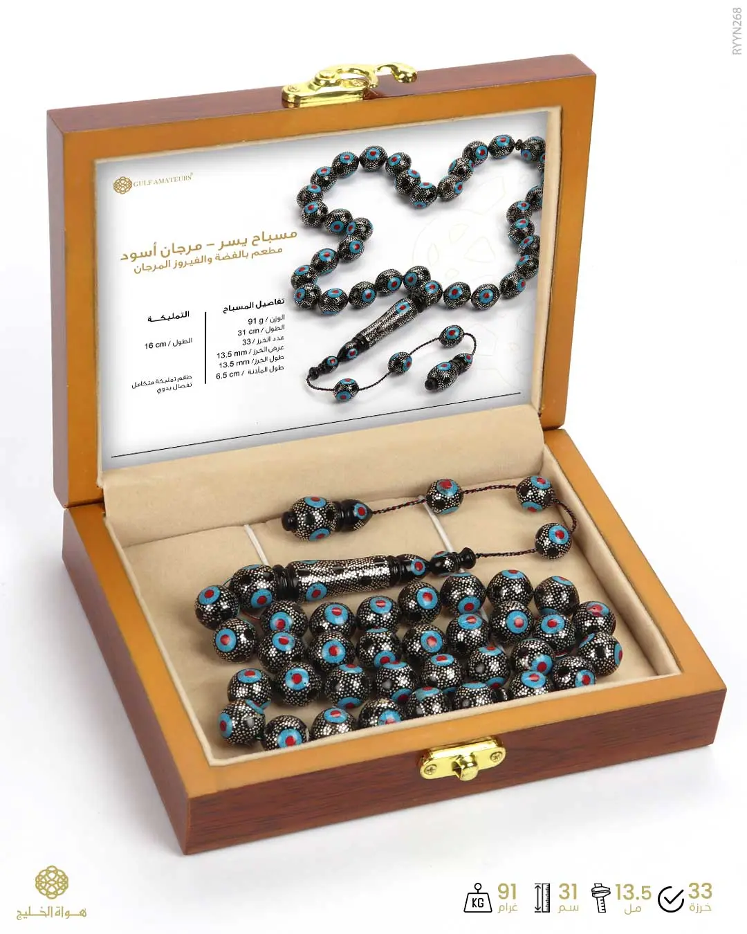 الرئيسيةمسباح المرجان (اليسر)مسباح المرجان (اليسر)الوصفسباح طبيعي من اليسر المرجان الأسود لون أسود منقوش ومطعم بالفضة والفيروز المرجان بِعدد 33 خرزةدائرية كبيرة يتوّجه طقم تمليكة متكامل مزخرف و منقوش بِتفصال يدوي فخم التقديم في علبة خشبية فاخرة خاصة للحفظ والإهداء