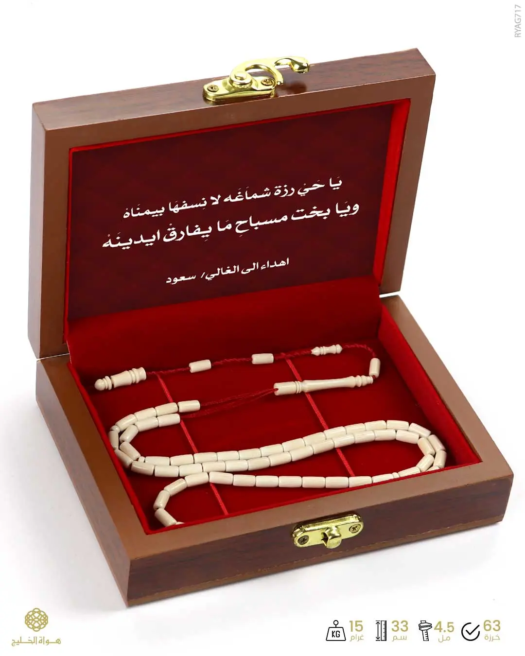 الرئيسيةمسباح عاج الفيلمسباح عاج الفيلالوصفمسباح من عاج الفيل لون عاجي صاك بعدد 63 خرزة كبسولية صغيرة يتوّجه طقم تمليكة فاخرمتكامل خراطة و تفصال يدوي التقديم في علبة أنيقة خاصة للحفظ و الإهداء