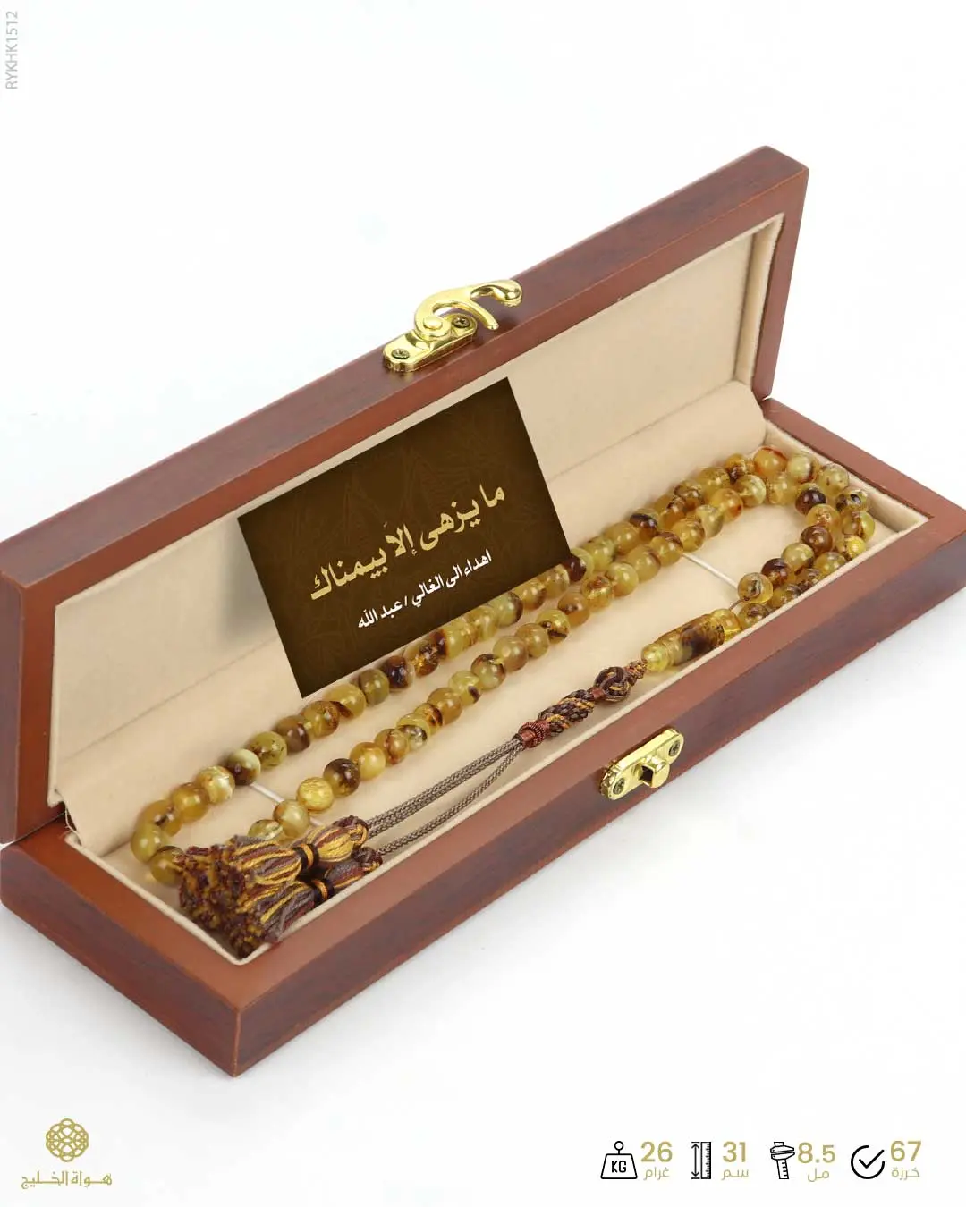 الرئيسيةكهرمان كالينغرادي كهرمان كالينغرادي الوصفمسباح من الكهرمان الكالينيغراندي لونه كريمي موشم عسلي واسود بعدد 67 خرزة دائرية فوّاحة بالعنبريتدلل بكركوش مبتكر من اجود الخيوط المشغولة يدوياً نقدم المسباح في علبة خشب فاخرة خاصة للحفظ و الإهداء