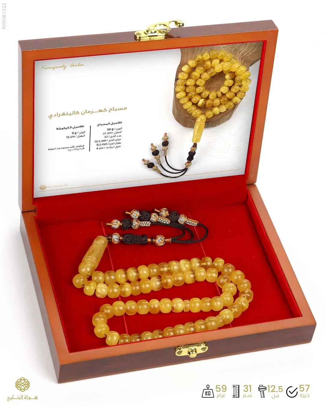 الرئيسيةكهرمان كالينغرادي كهرمان كالينغرادي الوصفمسباح من الكهرمان الكالينغرادي الطبيعي لونه عسلي مغيم بعدد 57 خرزة ذروية فوّاحة بالعنبريتدلل بكركوش مبتكر من أجود الخيوط المشغولة يدوياً نقدم المسباح في علبة خشب فاخرة خاصة للحفظ و الإهداء