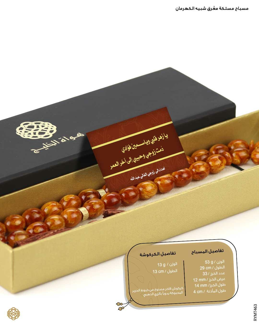 الرئيسيةمستكة شبيه الكهرمانمستكة شبيه الكهرمانالوصفمسباح من المستكة المعرق شبيه الكهرمان اللون معرق كرميلي غامق بعدد 33 خرزة بيضاويه كبيرة يتألق بفواصل مذهبة وكَركوشحريري فاخر بالزري الذهبي اليدوي وشعار تفصال إسم يقدم بعلبة هدايا أنيقة وكرت إهداء فخم