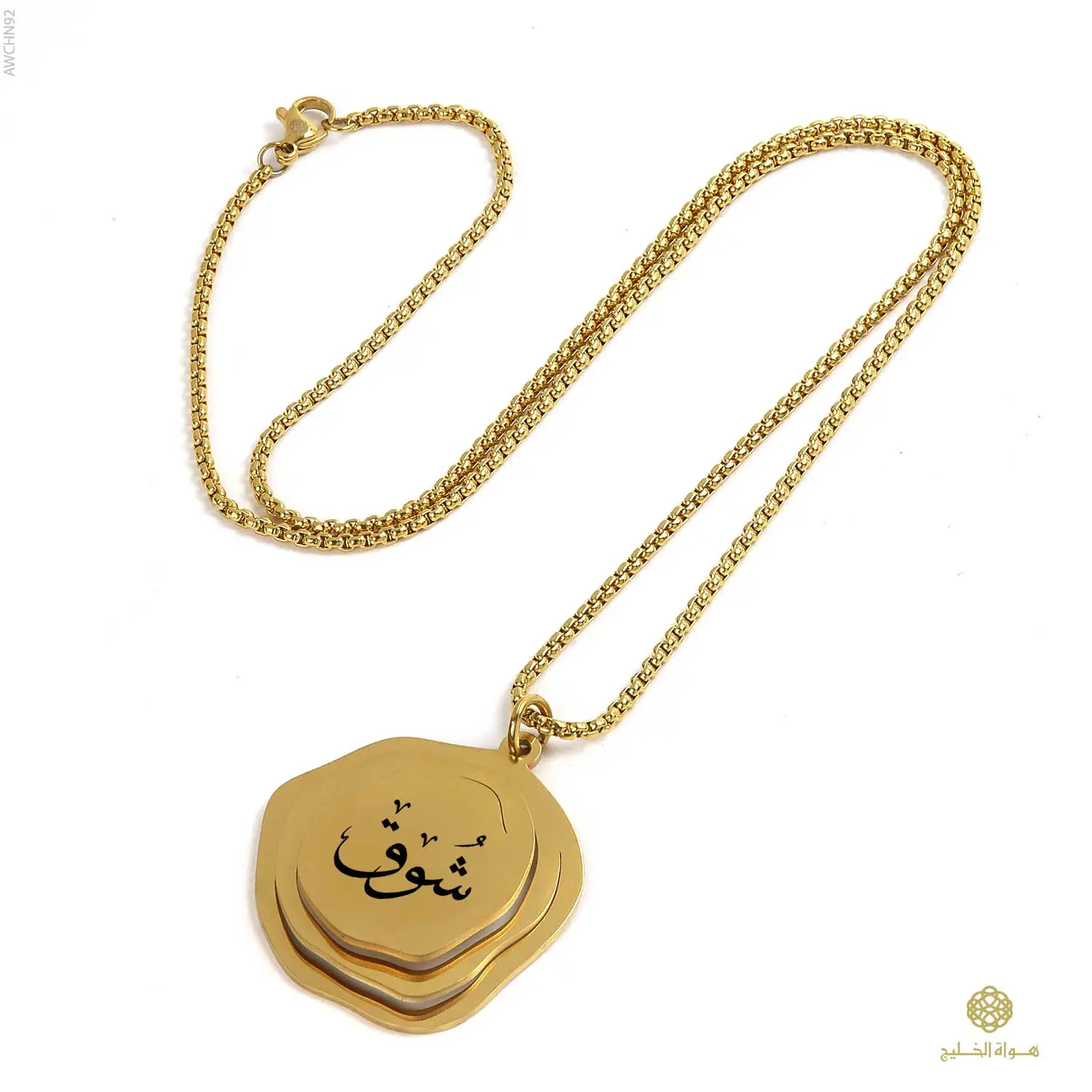 الرئيسيةقلادة نسائيةقلادة نسائيةالوصفقلادة بطابع كلاسيكي فاخر بتصميم متعدد الطبقات مع نقش عربي أنيق بإسمك يعكس ذوق راقٍ وهوية مميزةتفاصيلها المتقنة ولمعتها الهادئة تجعلها قطعة مثالية للاستخدام اليومي أو كهدية فخمة، متوفرة بالذهبي والفضياللونذهبيفضي