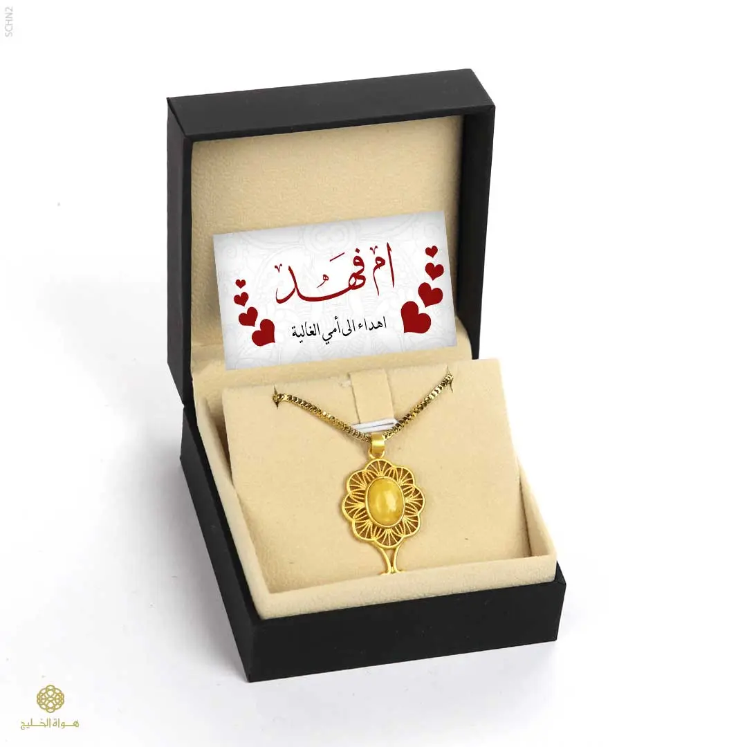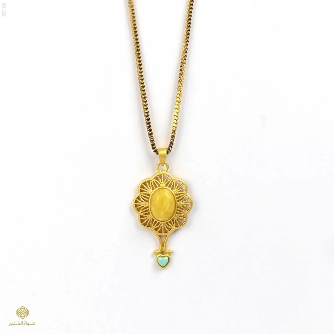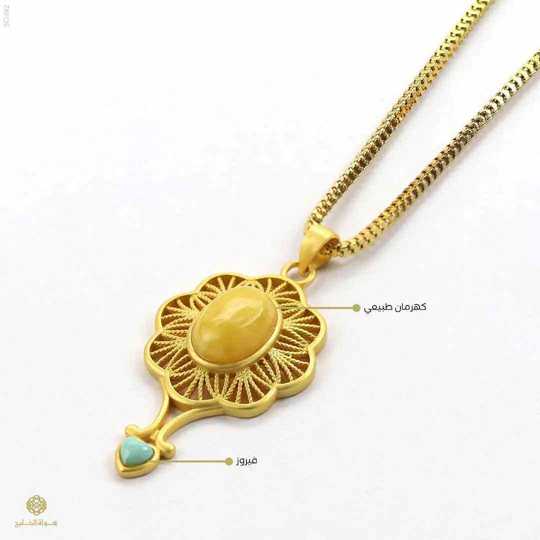 قلادة بتصميم فاخر مستوحى من الطابع الكلاسيكي، تتميّز بتفاصيل زخرفية دقيقة تعكس الحرفية العالية. تتوسطها قطعة من الكهرمان الطبيعي تضيف دفئاً وأناقة،