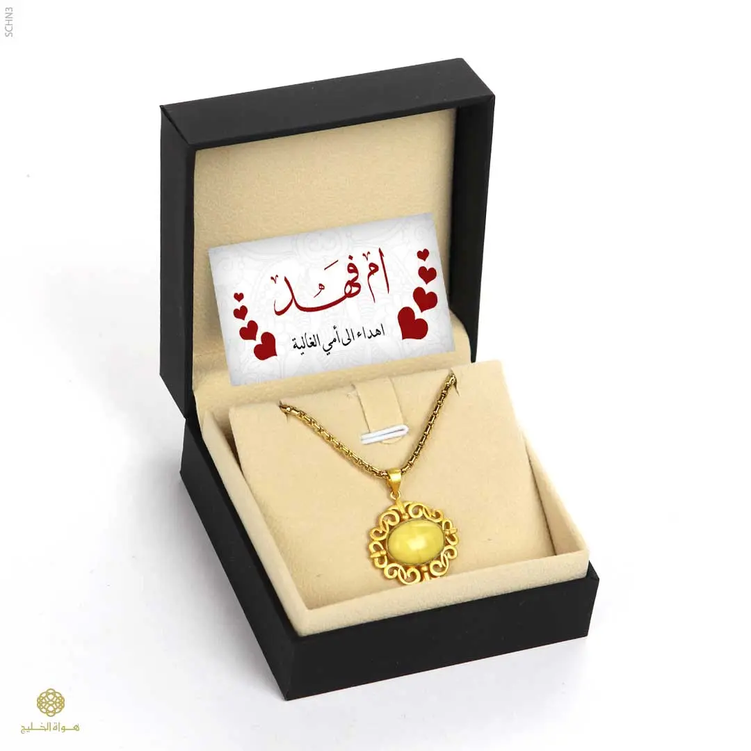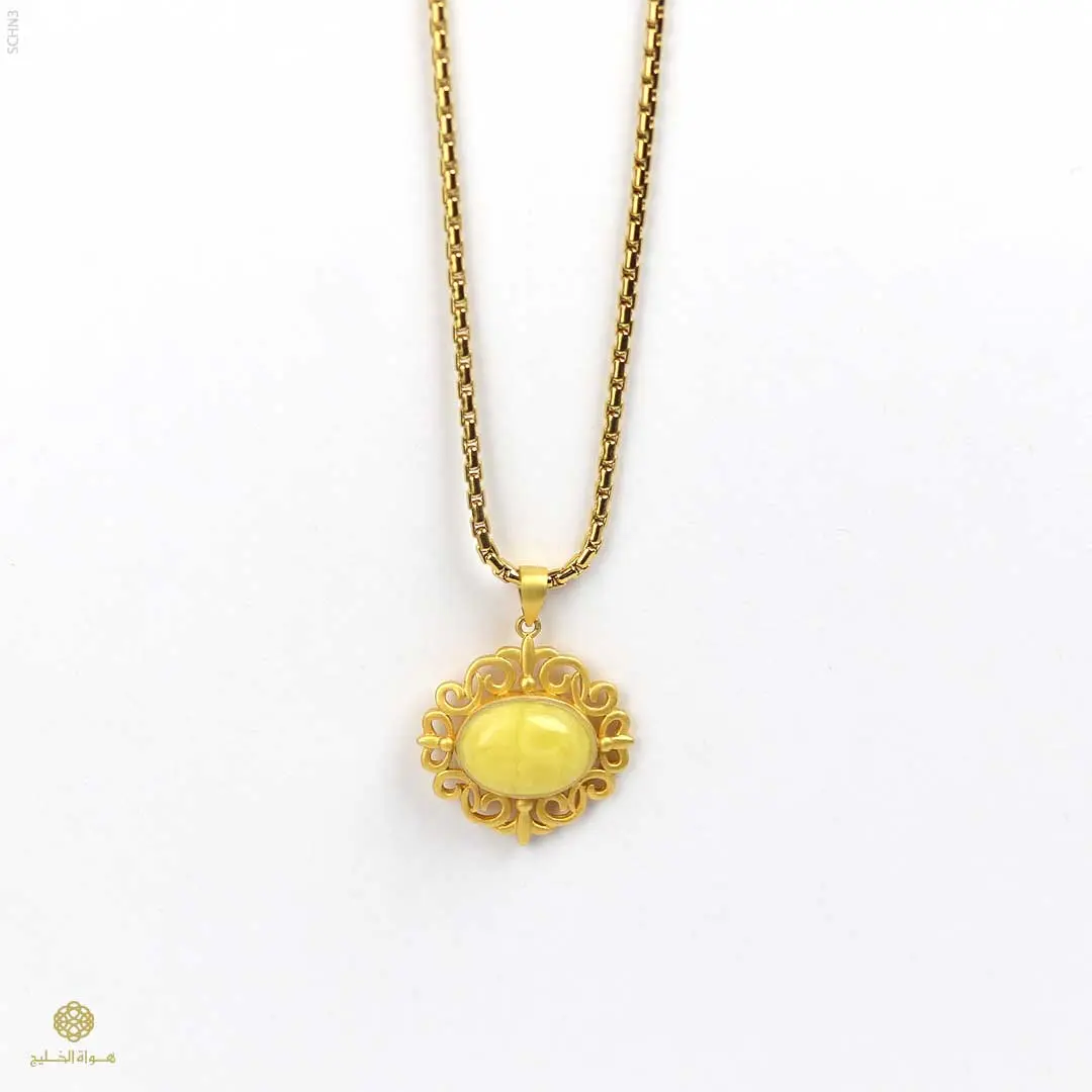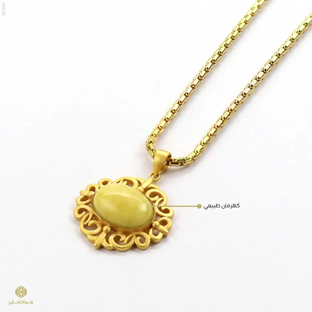 قلادة بتصميم فاخر مستوحى من الطابع الكلاسيكي، تتميّز بتفاصيل زخرفية دقيقة تعكس الحرفية العالية. تتوسطها قطعة من الكهرمان الطبيعي تضيف دفئاً وأناقة