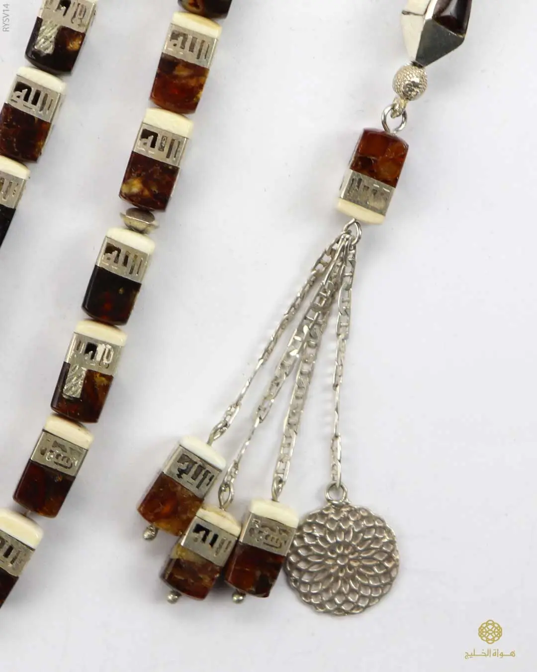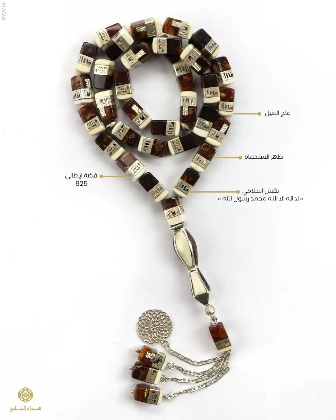 قطعة فنية من الفضة الإيطالية عيار 925، مطعّمة بظهر السلحفاة الطبيعي مع لمسات من عاج الفيل، تتناغم مع نقش إسلامي دقيق «لا إله إلا الله محمد رسول الله» ليعكس جمال التفاصيل ودقة الصنع.