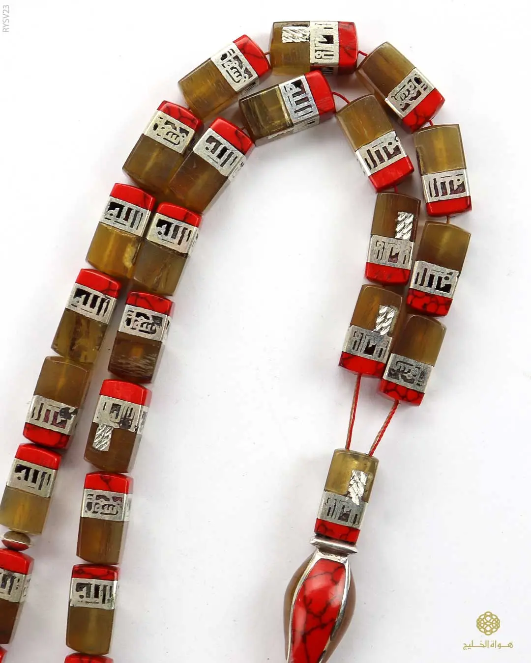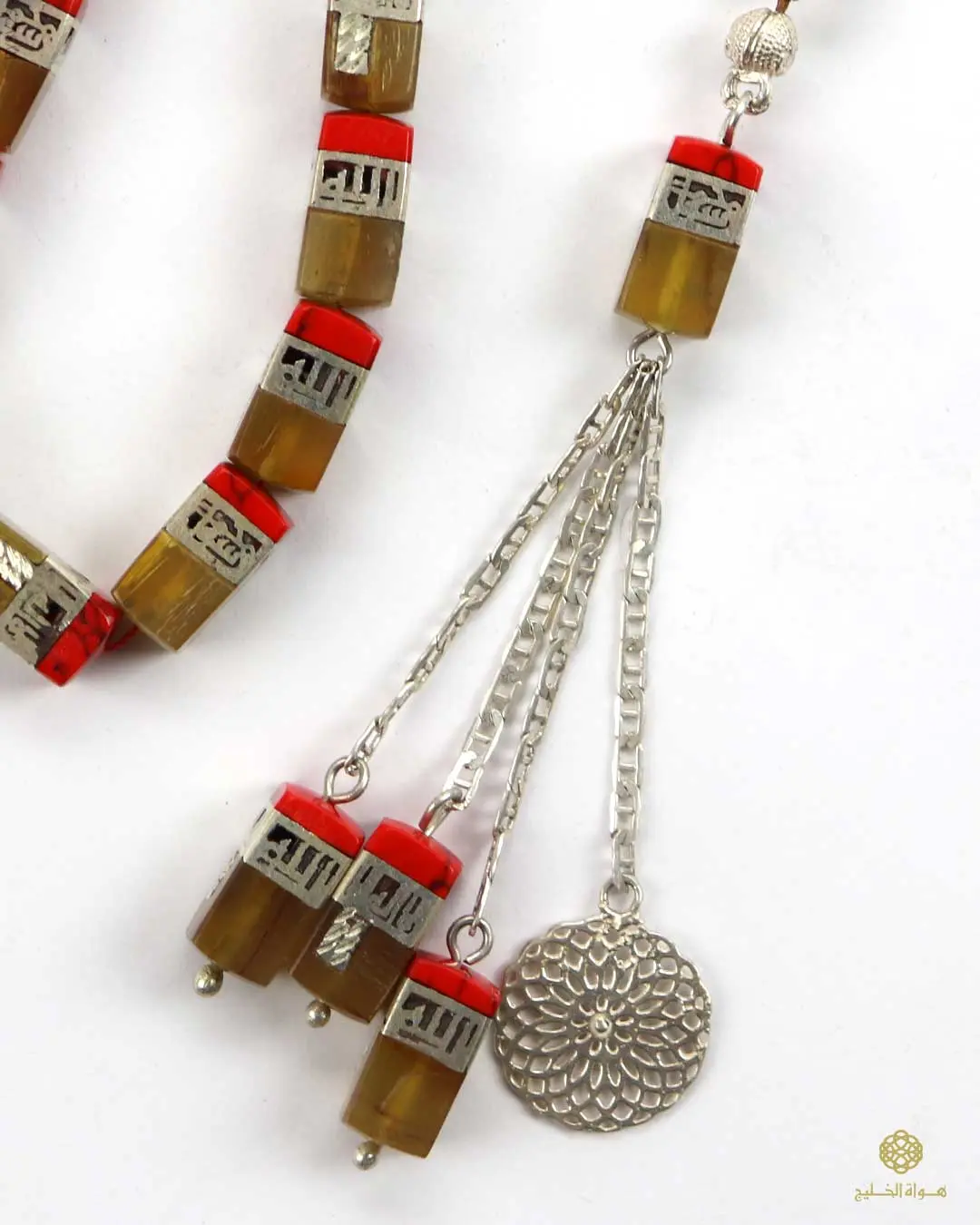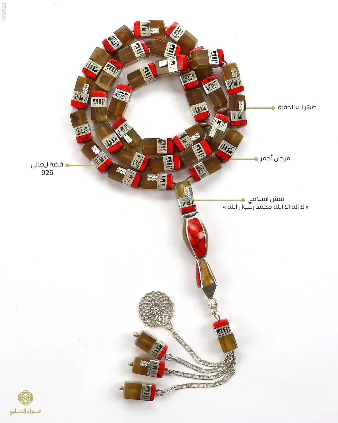 قطعة فنية من الفضة الإيطالية عيار 925، مطعّمة بظهر السلحفاة الطبيعي ولمسات من المرجان الأحمر، مع نقش إسلامي دقيق «لا إله إلا الله محمد رسول الله»