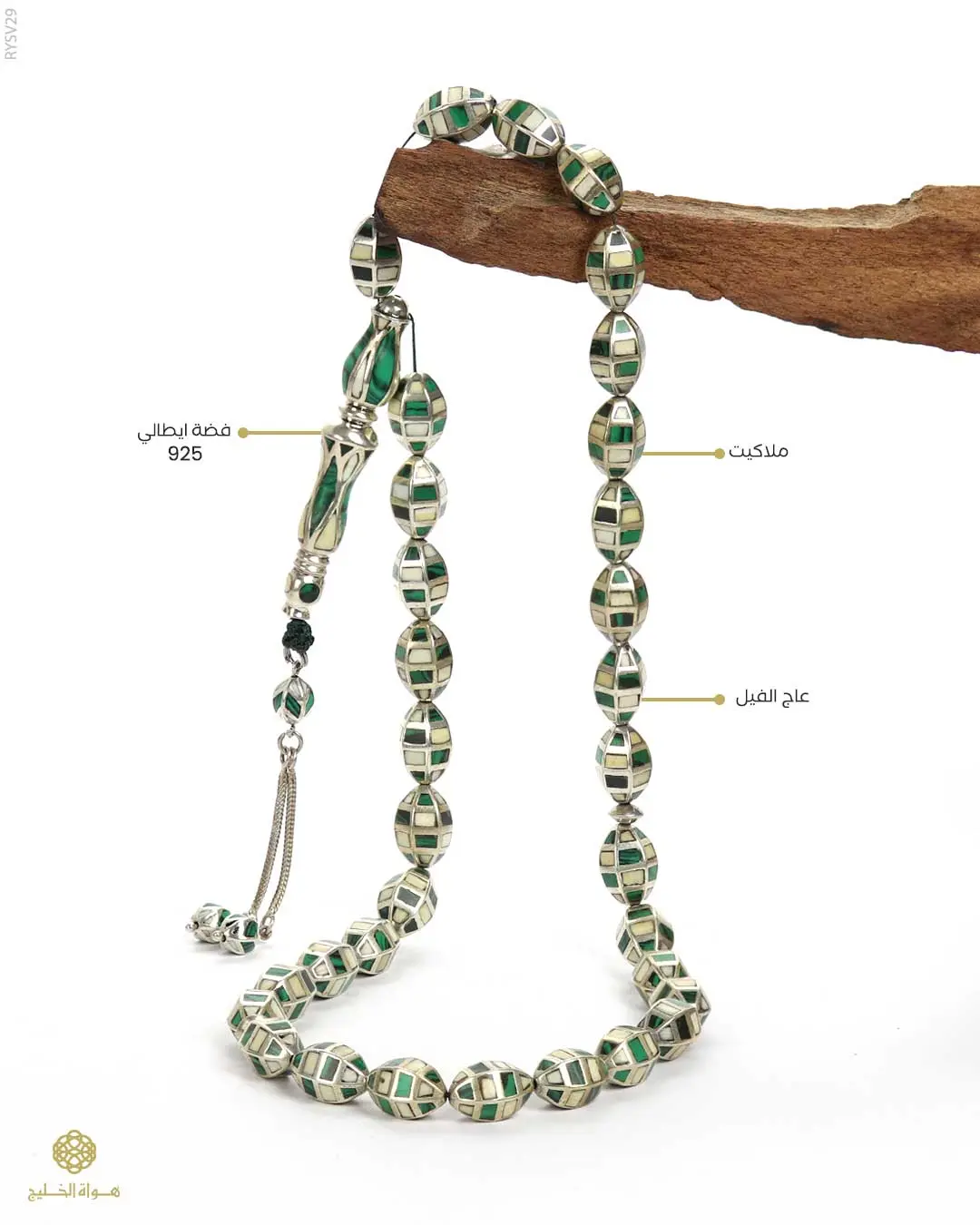 قطعة فنية من الفضة الإيطالية عيار 925، مطعّمة بعاج الفيل الطبيعي مع لمسات من حجر المالاكيت الأخضر، بتنسيق هندسي دقيق يعكس فخامة التفاصيل وأناقة التصميم