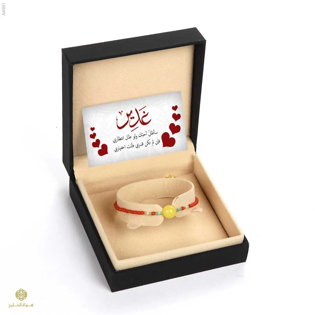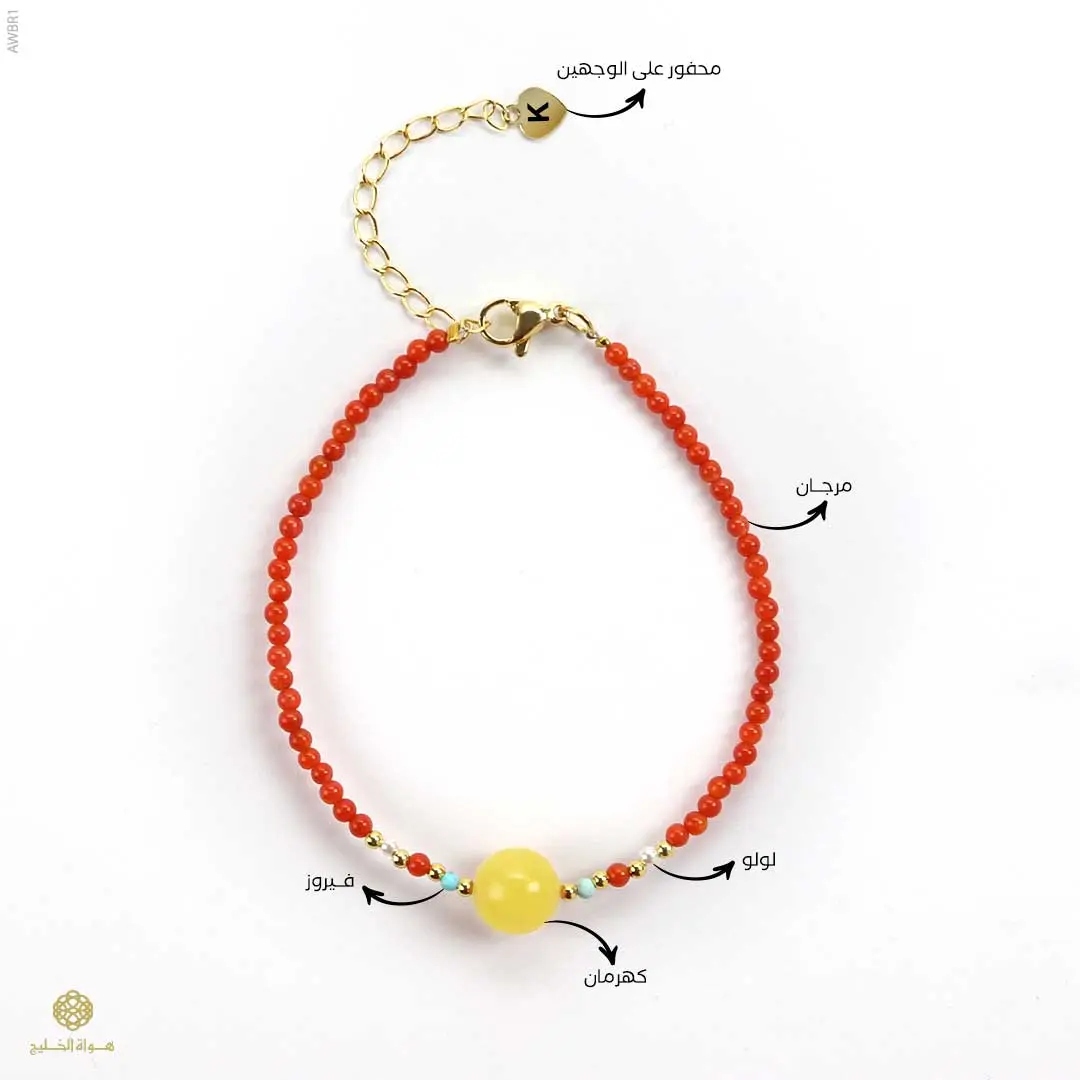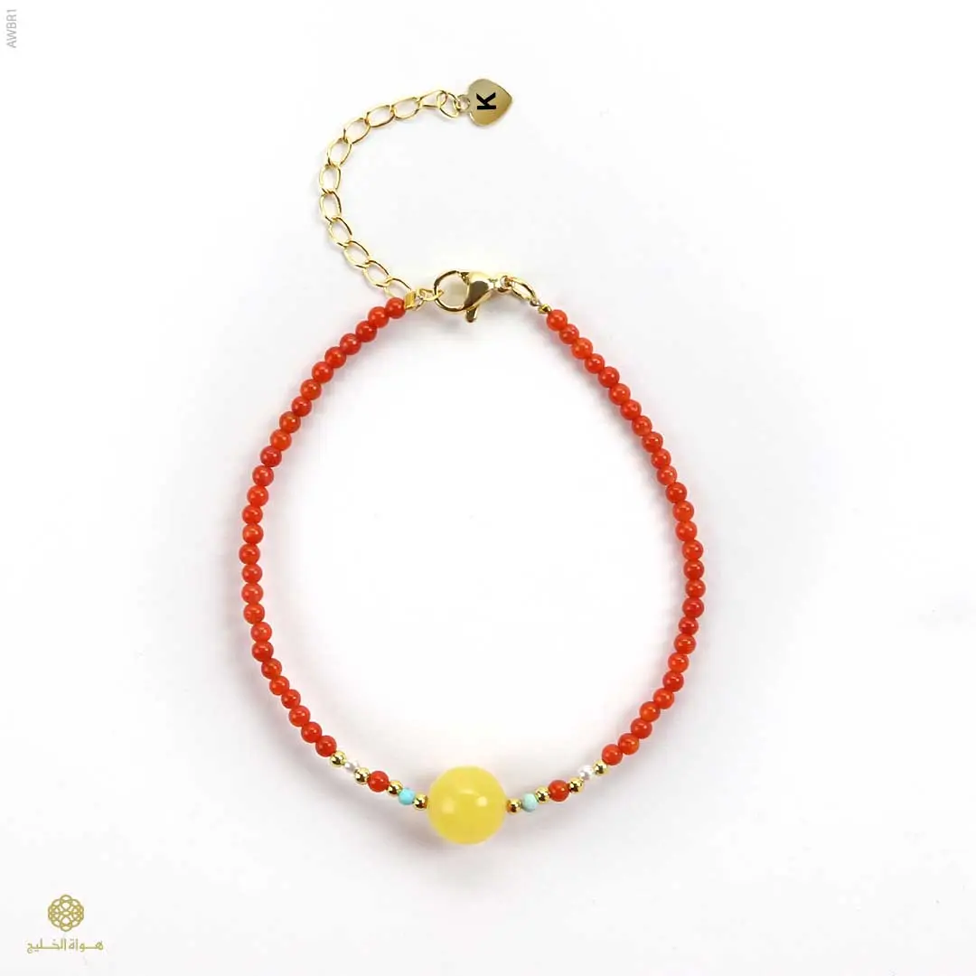 سوار أنيق بتصميم ناعم يجمع بين ألوان نابضة وتفاصيل راقية، مصنوع من خرز المرجان الطبيعي مع لمسات من الفيروز واللولو، ويتوسطه حجر كهرمان يضفي طابعاً فاخراً وجاذبية مميزة