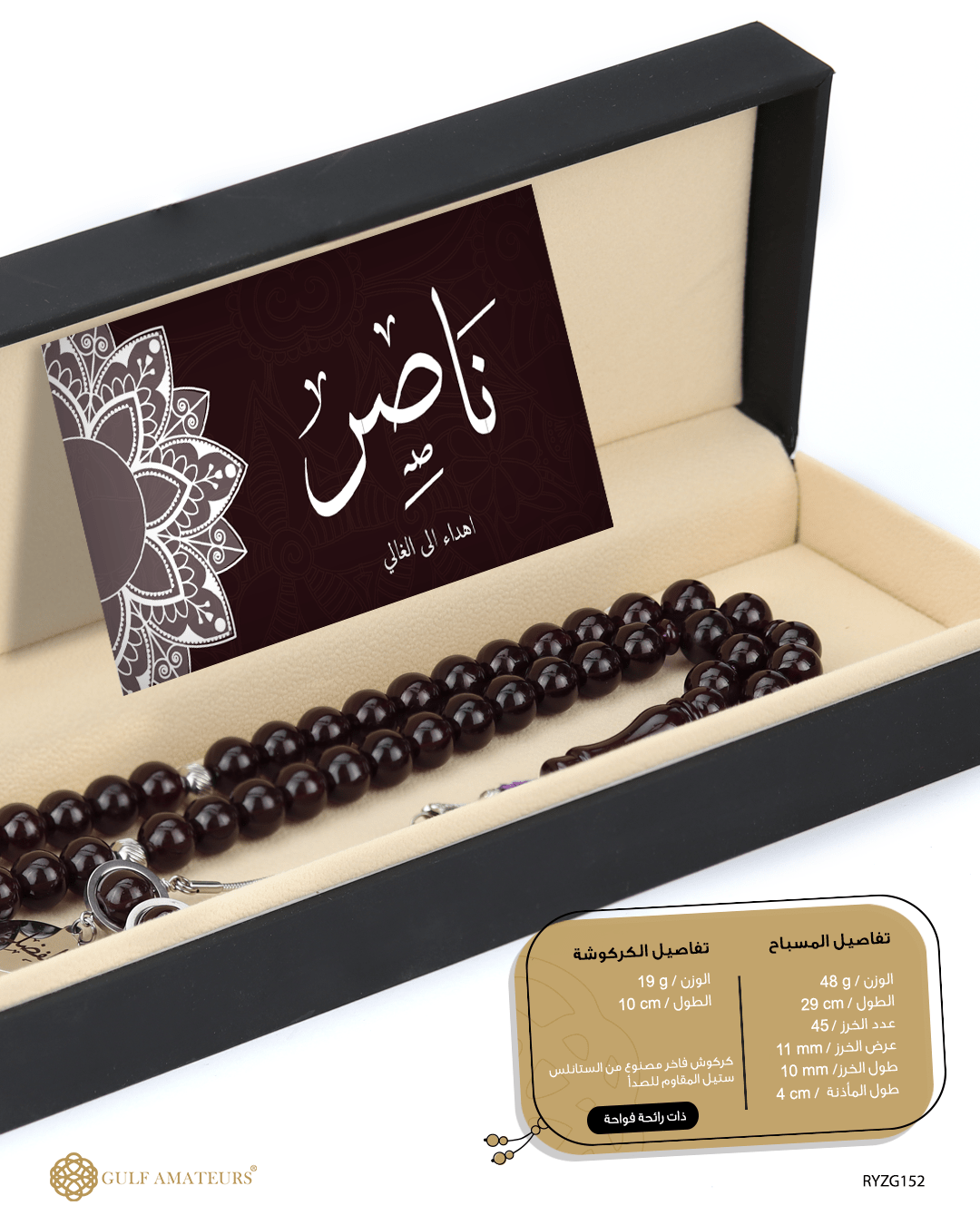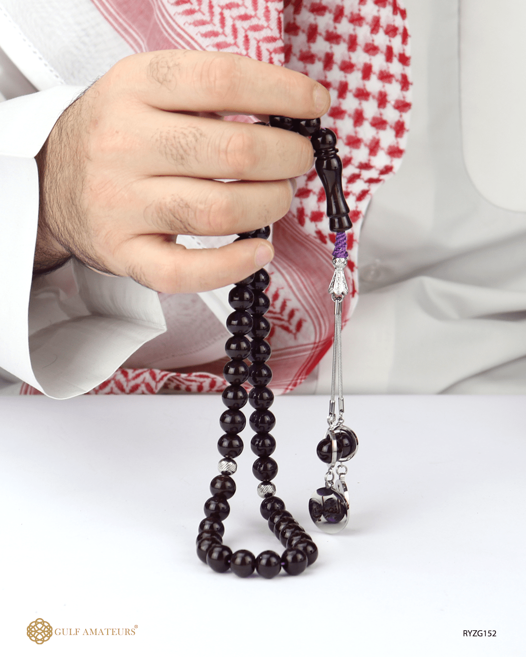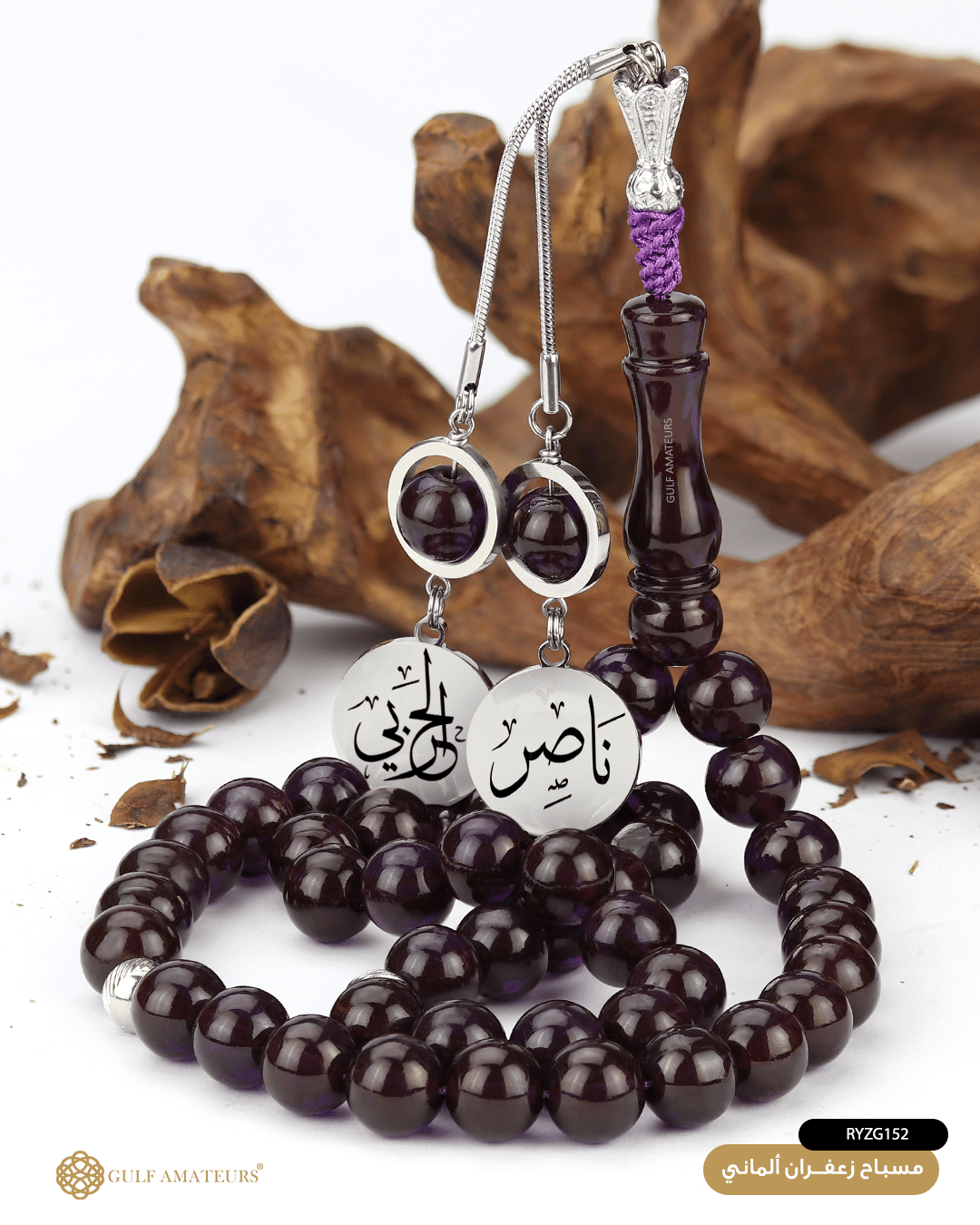 مسباح منحوت من الزعفران الألماني بلون بنفسج غامق بعدد 45 خرزة مكحلة دائرية متوسطة فواحة بالزعفران يتوجه طقم فواصل وكركوش فاخر